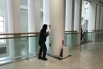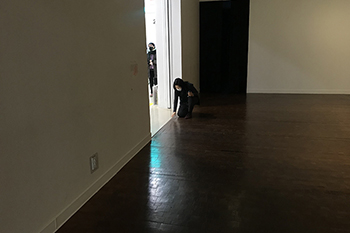 The performer playin a docent strokes and rubs buttons and thresholds at the museum, explaining the invisible labor structure in the place.