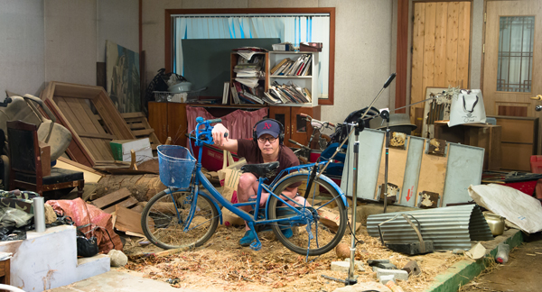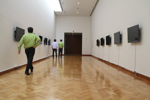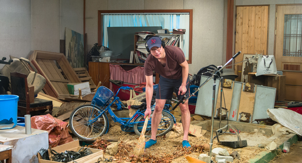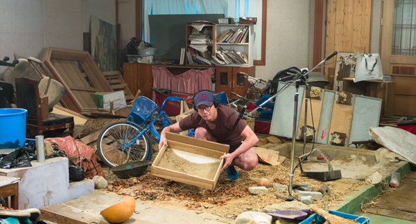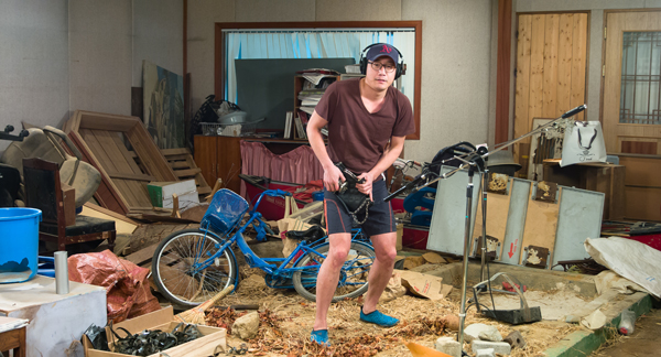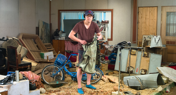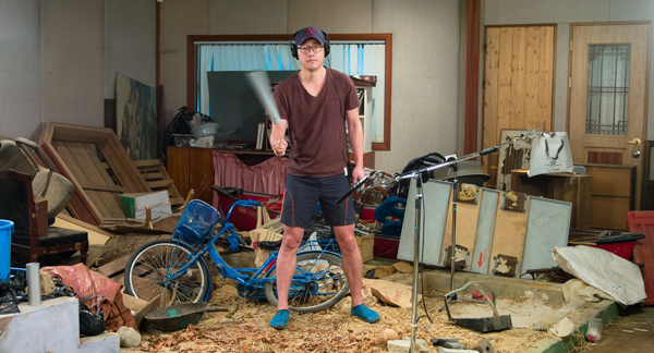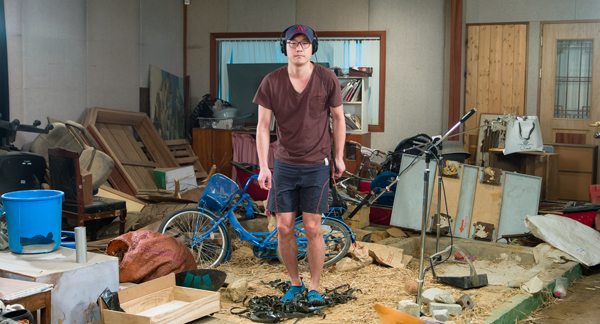 10 Channel video installation of Changho Lee, a Foley artist, producing sounds that can be heard in vacation places. The videos were installed in a corridor gallery within an office building of Sindoh, a photocopy machine company.