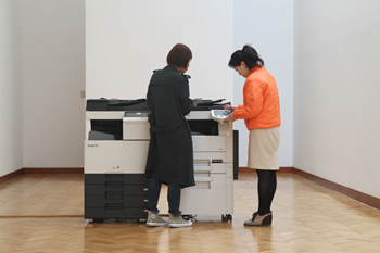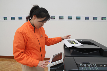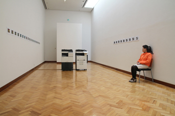Throughout the exhibition, Juyeon Hong, an employee for Sindoh - photocopying machine company, performed in the corridor gallery making photocopies of a travel postcard using various colours, contrast, saturation, sizes, etc as audiences requested.