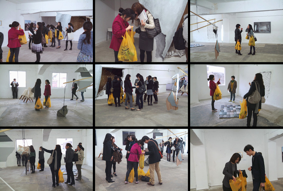 Performance in which the participating artists at an exhibition opening are given bags of groceries their typical dinner habits. At the exhibition's private viewing, artists meet audiences while carrying E-Mart’s yellow plastic bags. After the event, they can bring the groceries and prepare supper home. The title of the work is a parody of Marcel Duchamp’s work La boîte-en-valise.