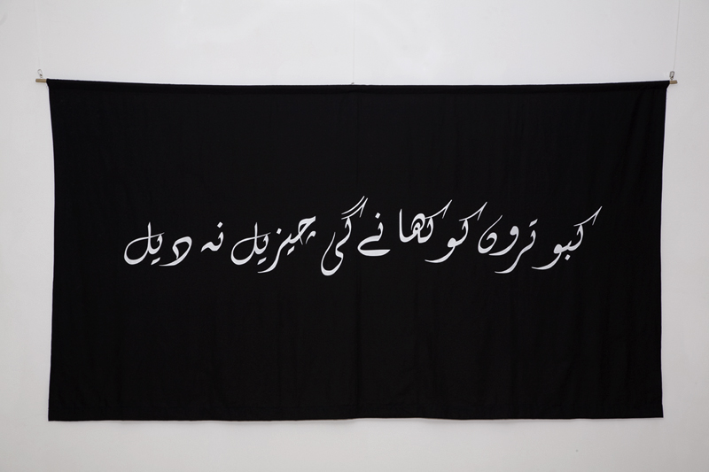 A commissioned work for an exhibition titled 'visual vocabulary: between image and word' in north London, which has many Pakistani and Indian neighbors. This piece repeats sign outside the gallery reading "Do not feed the pigeons" in Urdu (the official language of Pakistan) on black fabric. Due to the Arabic alphabet of the warning sentence and the black cloth, which reminds of the form of the Muslim flag, it is interpreted very differently than its literal meaning.