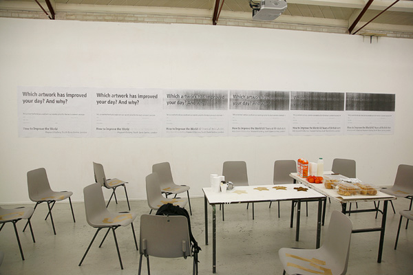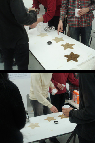 Enlarged photocopies of a comment card taken from the Hayward gallery asking 'which artwork has improved your day?', loose sugar for tea arranged in shaped piles and numbered chairs. The stars and numbers disappear when audience takes a seat to drink tea at the start of the seminar. In this seminar, I was not allowed to talk about what my work was about.
