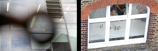 Isn't X amazing? As I said, isn't it shame that X is not in this show? Fortunately, her studio is in the building opposite where you are standing now. I am sure, if you are lucky, you might see her breath-taking work. Come closer to the desk. You have to look up through the middle window at the top. Yes, the small window that is open. Put your hand on the desk. It will help you to look up through the window.